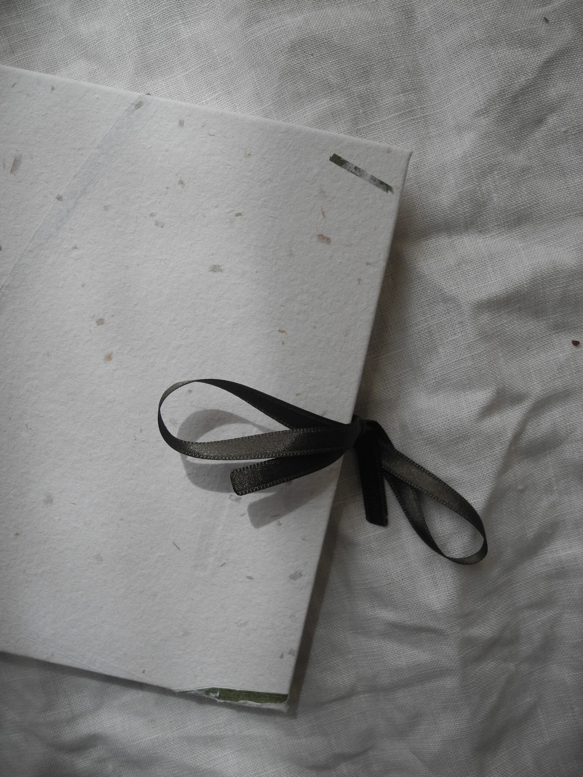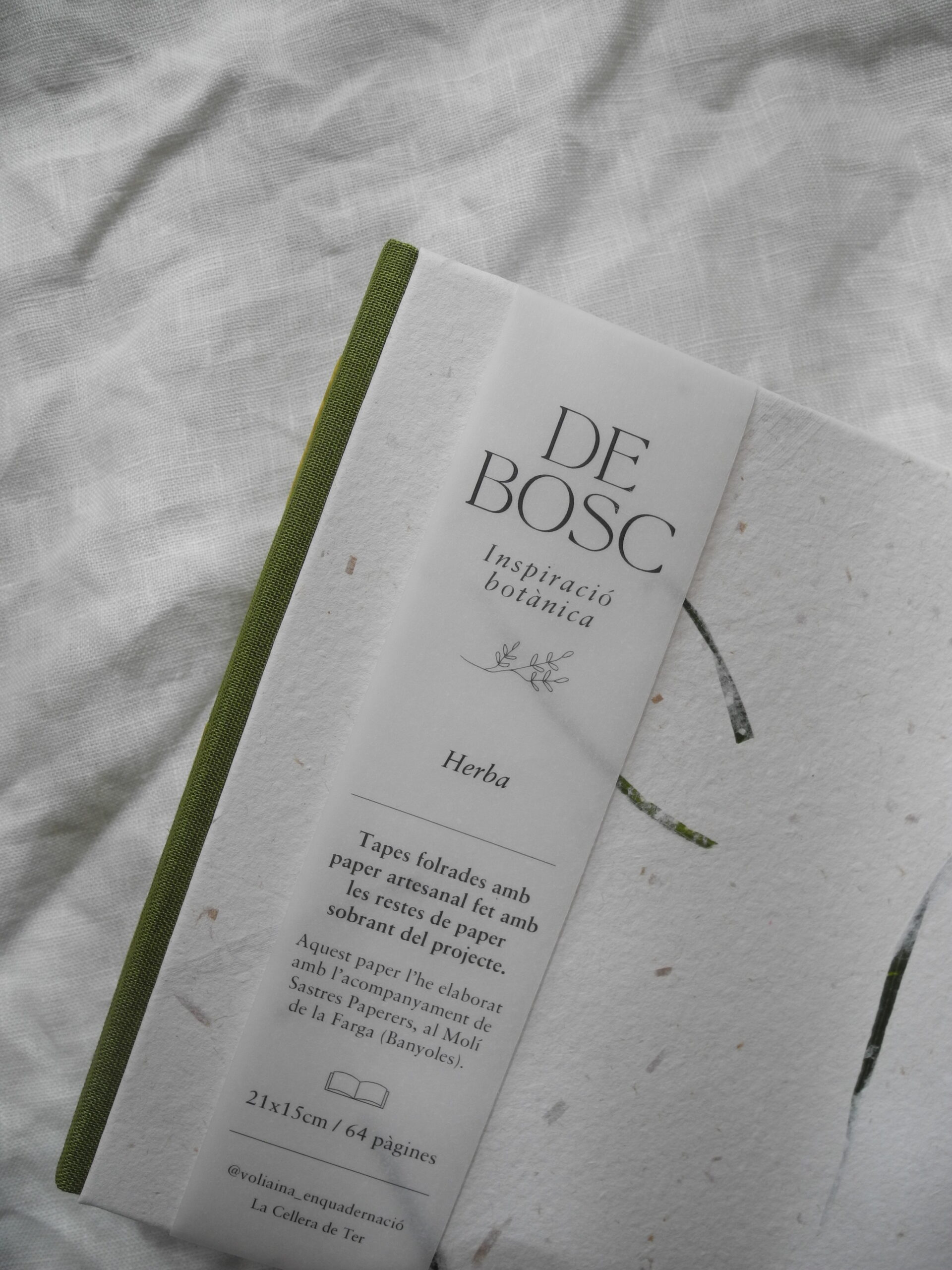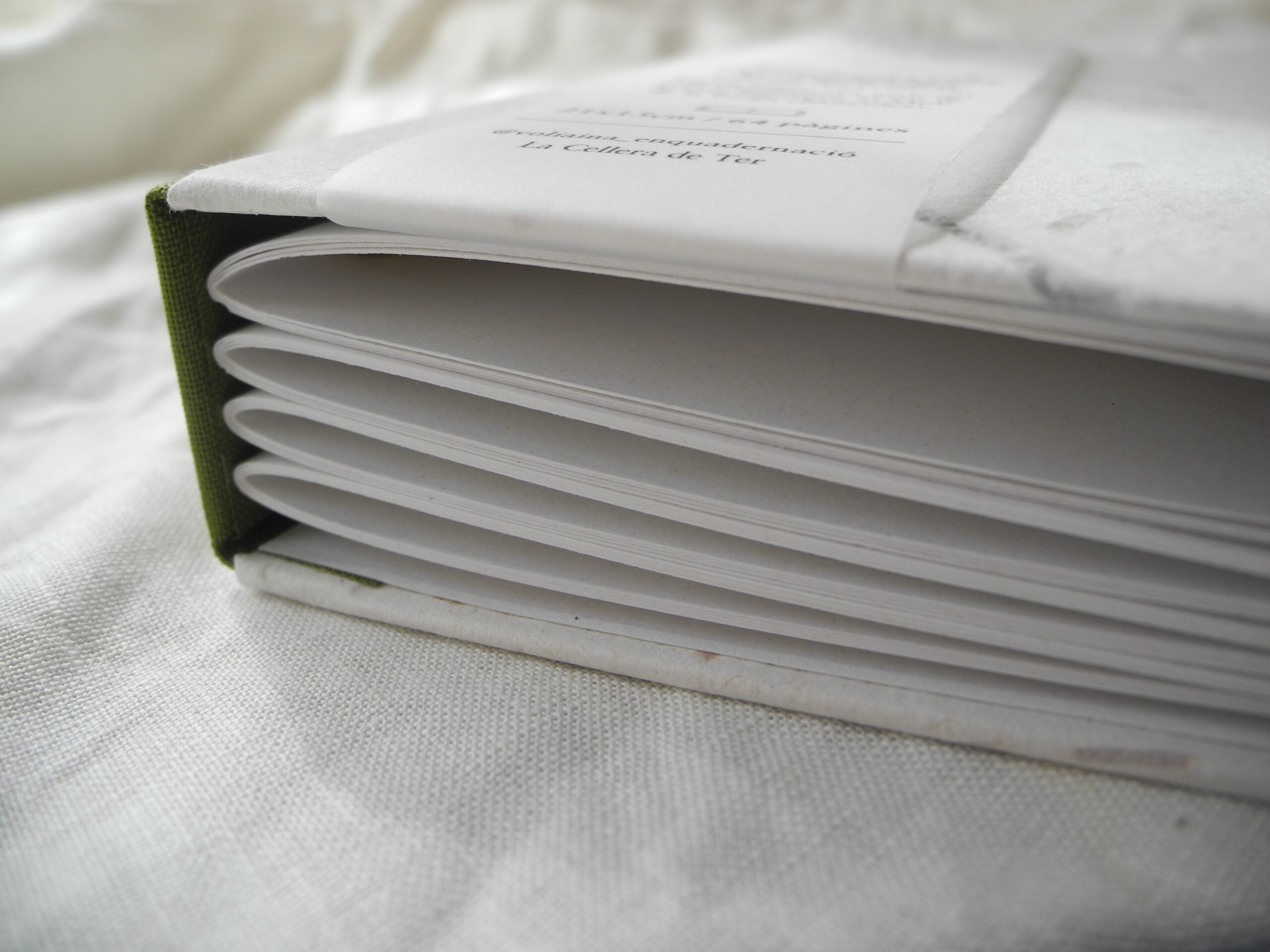 Tapa dura folrada amb paper artesanal d’herba, fet amb les restes de paper sobrant del projecte.