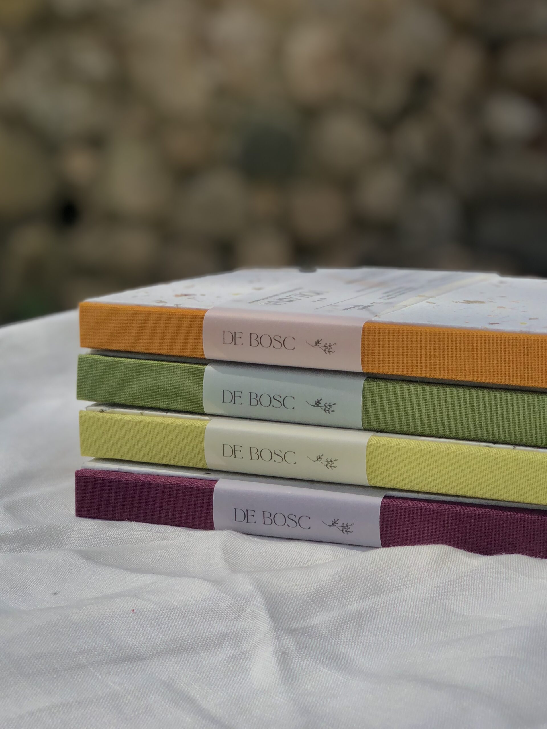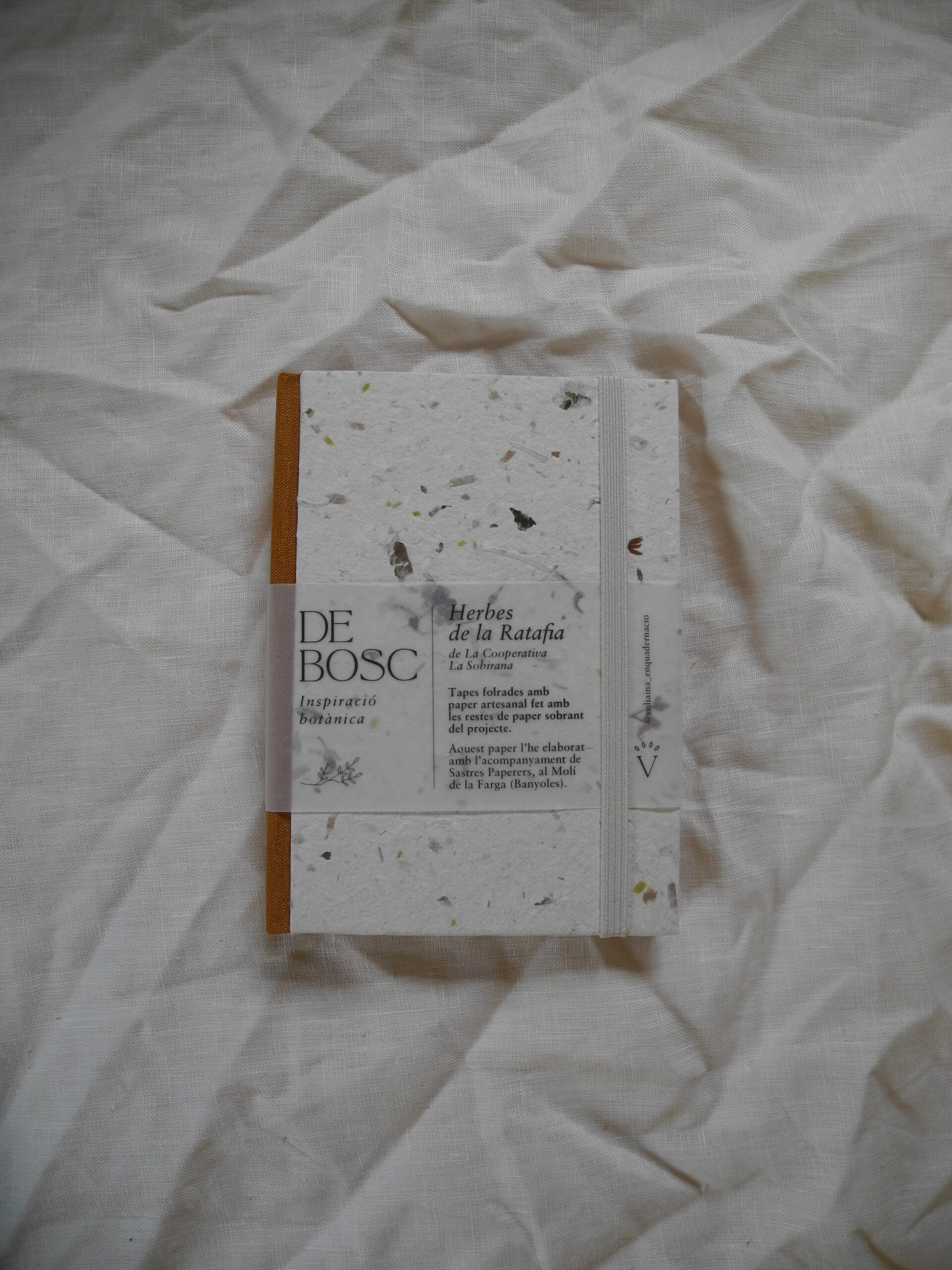 Tapa dura folrada amb paper artesanal d’herbes de la ratafia de la Cooperativa La Sobirana, fet amb les restes de paper sobrant del projecte.