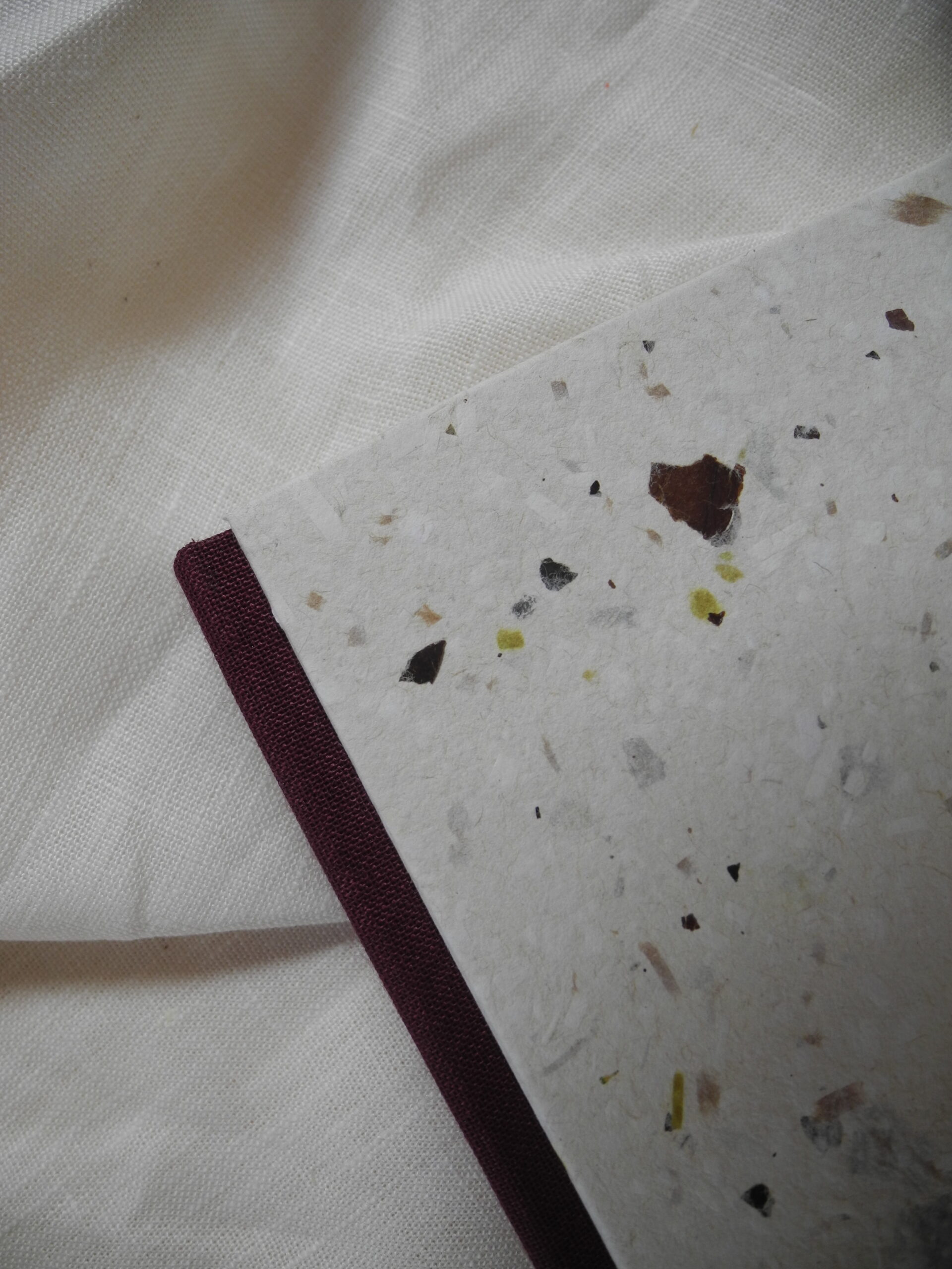 Tapa dura folrada amb paper artesanal amb roses seques de Sant Jordi, fet amb les restes de paper sobrant del projecte.